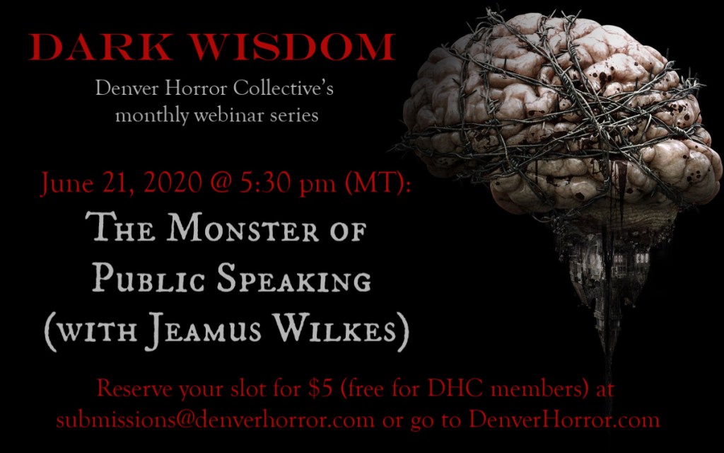 Horror author Jeamus Wilkes shares his experience and a survey of public speaking principles to drive a stake through the heart of any fears you may have of stepping up to the microphone or turning on the webcam. In your efforts to widen your reading audience, learn how Jeamus has positively dealt with his own introvert-leanings to step onto the stage and not fear the engagement with the randomness of a live audience.