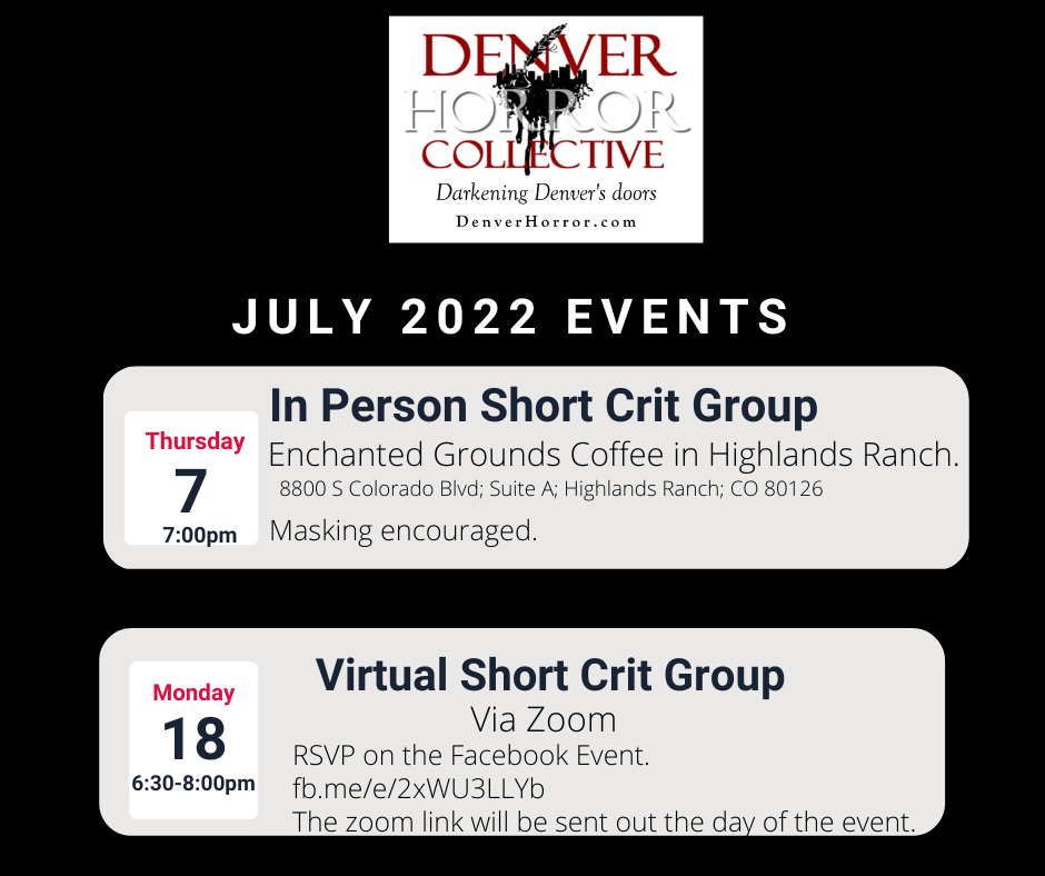 Thursday, July 7 @ 7 pm: In Person Short Fiction Crit (RSVP via Facebook or email seanmurphy5292 [at] gmail.com)