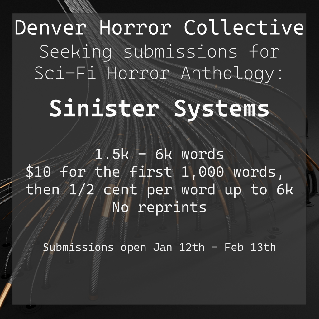 Denver Horror Collective is seeking submissions for a Science Fiction Horror anthology: SINISTER SYSTEMS. Send us your stories of first contact gone wrong, the bio weapon that escapes containment, or an AI bleeding into the real world with disastrous results. We’re looking for mad science (Resident Evil), cosmic horror (Event Horizon), incomprehensible alien life (Annihilation), and more.