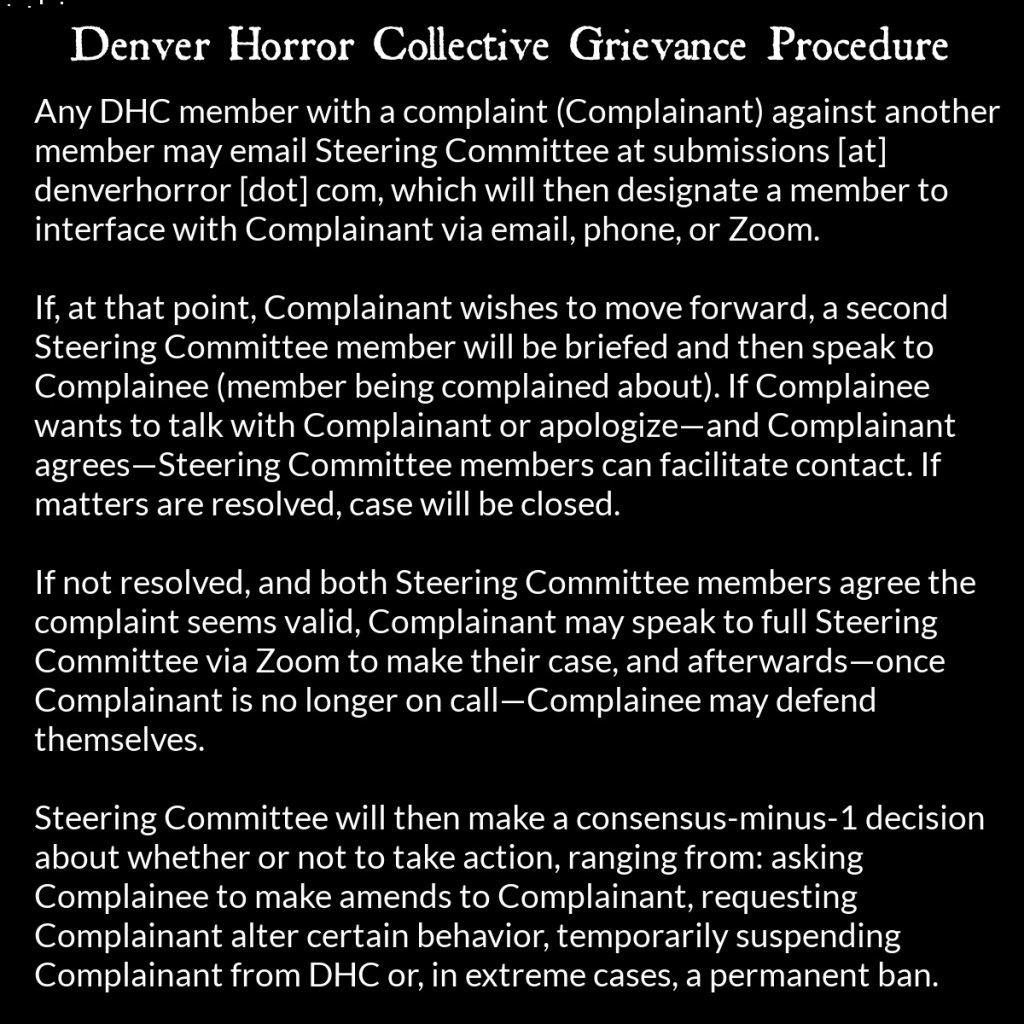 Anyone with suggestions, concerns, or complaints regarding Denver Horror Collective are encouraged to contact the Steering Committee at submissions@denverhorror.com.